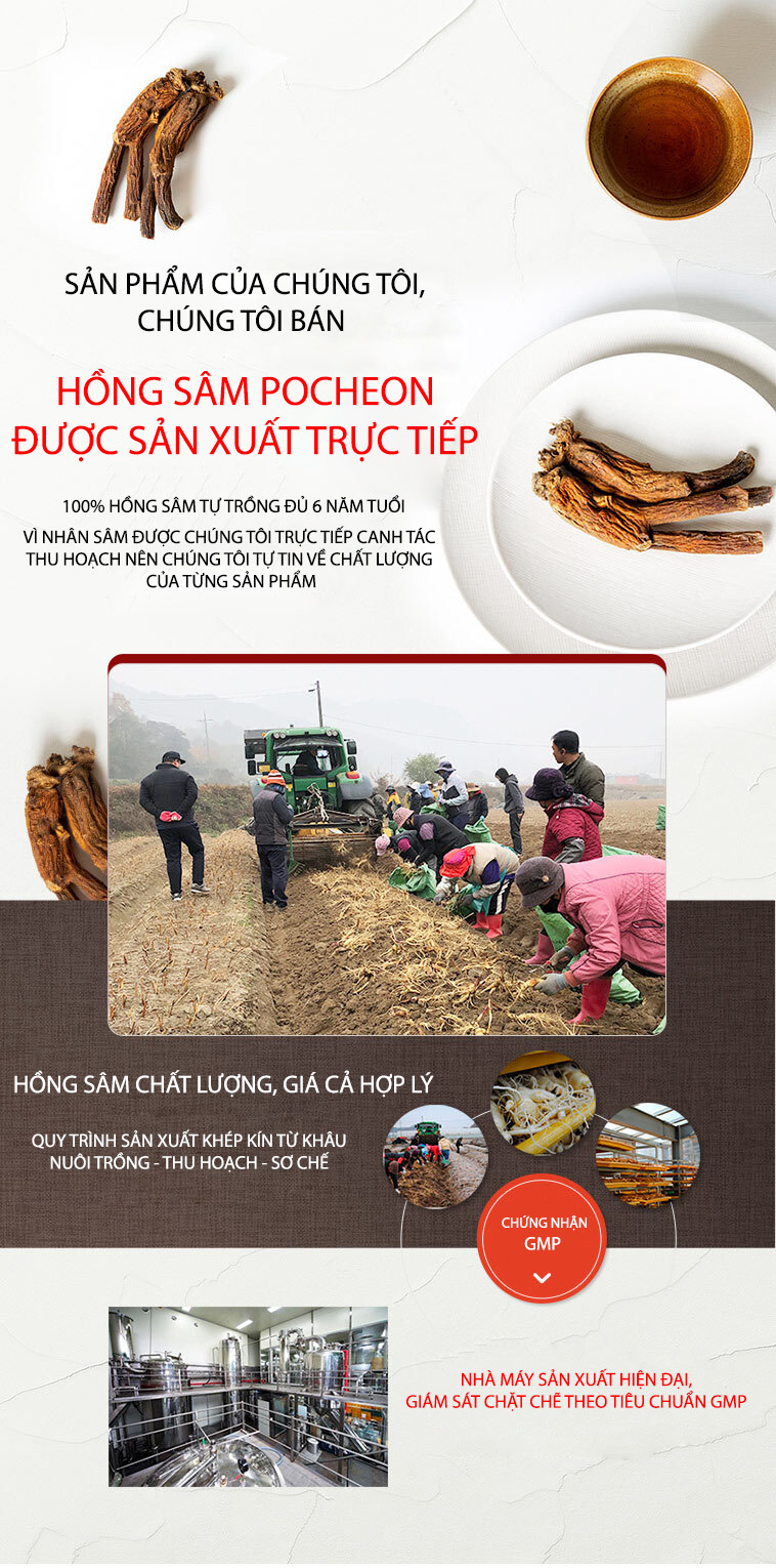 Hồng Sâm Pocheon là thương hiệu hồng sâm hàng đầu của Hàn Quốc được thành lập từ năm 2005 kế thừa  kỹ thuật chế biến và sản xuất nhân sâm với bề dày hơn 40 năm của Hàn Quốc. Những sản phẩm tới từ thương hiệu hồng sâm Pocheon được chiết xuất từ nhân sâm 6 năm tuổi của Hàn Quốc theo phương thức truyền thống, đảm bảo an toàn vệ sinh thực phẩm và giữ nguyên được hàm lượng những dưỡng chất quý giá trong từng thành phẩm. Trong suốt quá trình hình thành và phát triển hồng Sâm Pocheon luôn nỗ lực mang tới cho người tiêu dùng những sản phẩm có chất lượng tốt với giá thành rẻ.